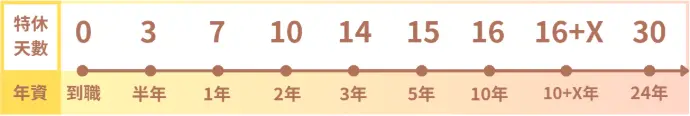 注意: 滿 10 年起,每多 1 年就加 1 天,最高上限至 30 天。